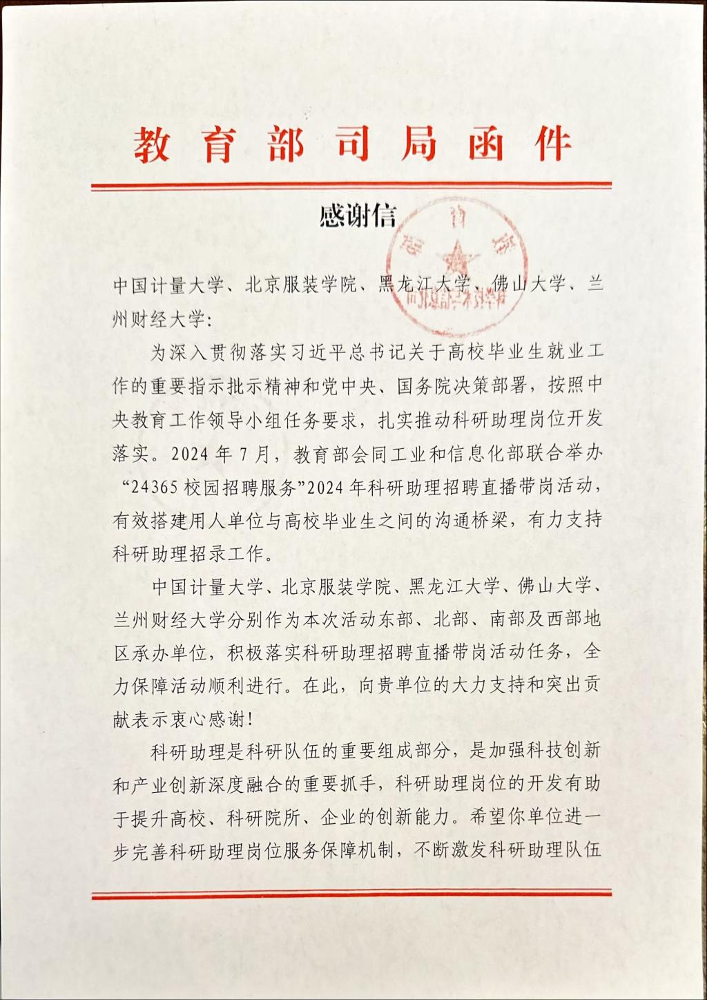 近日,教育部科学技术与信息化司、教育部高校学生司(高校毕业生就业服务司)和工业和信息化部规划司向兰州财经大学发来感谢信,高度评价了我校在2024年“‘职’在科研·‘就’有未来 2024年科研助理招聘直播岗活动”中的优异表现。信中提及,我校作为本次活动西部地区的承办单位,积极落实科研助理招聘直播带岗活动任务,全力保障活动顺利进行,为提升高校、科研院所、企业的创新能力以及加强科技创新和产业创新深度融合做出了杰出贡献。